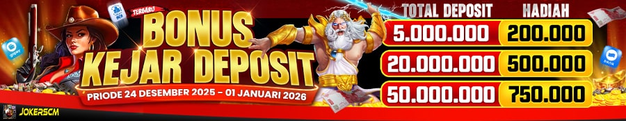 - BONUS KEJAR DEPOSIT NATAL & TAHUN BARU berlaku untuk seluruh member JOKERSCM yang memenuhi S&K minimal TOTAL DEPOSIT dan TOTAL TO dalam periode 24 Desember 2025 - 01 Januari 2026